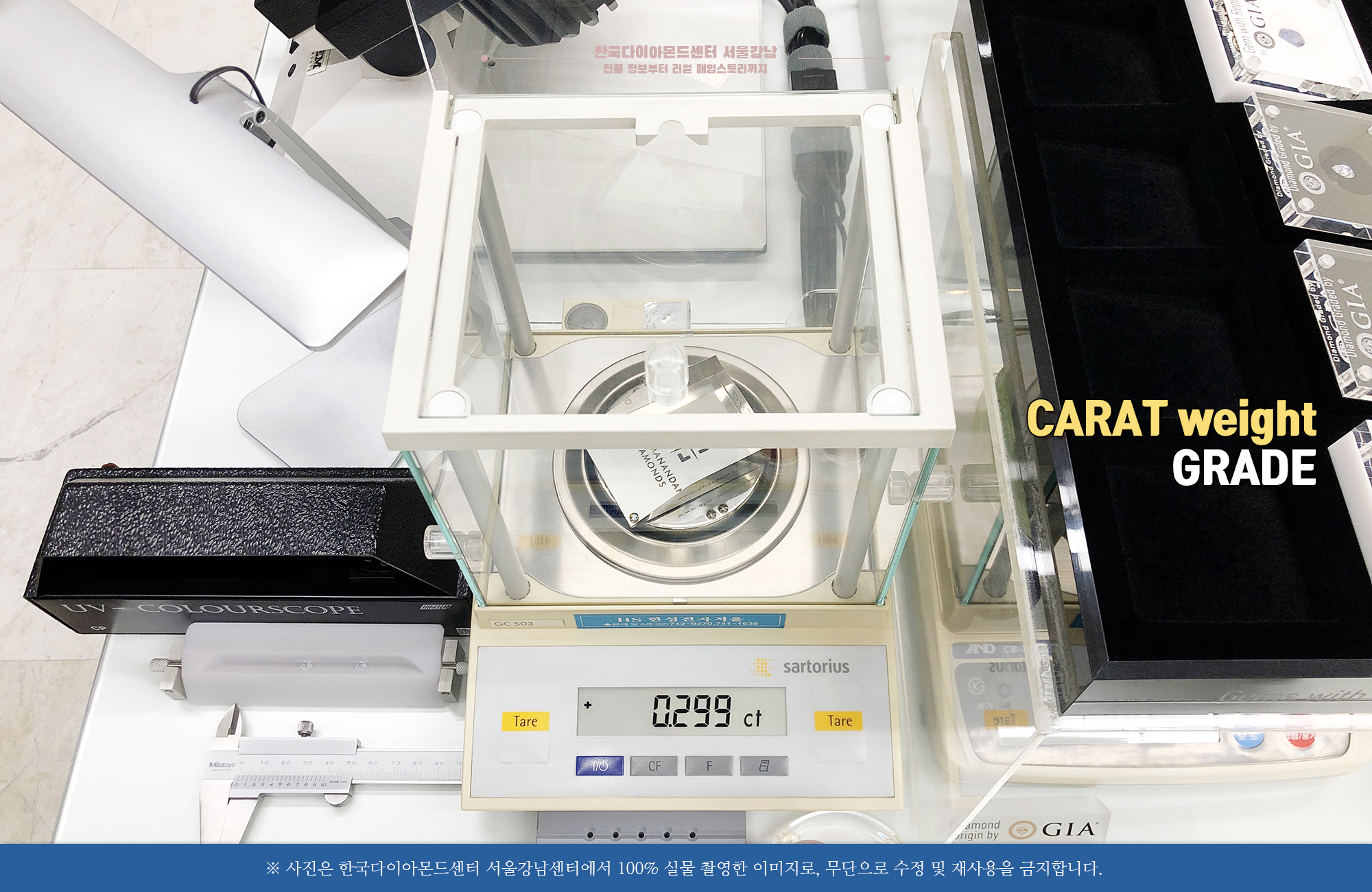 캐럿 중량(carat weight) - 감정서에 발행되어 있는 등급은 0.30캐럿 입니다. 실제 저울에서 확인되는 중량은 0.299캐럿으로 소수점 세번째자리 '9' 올림되어 감정서와 동일한 0.30캐럿 다이아몬드 입니다.