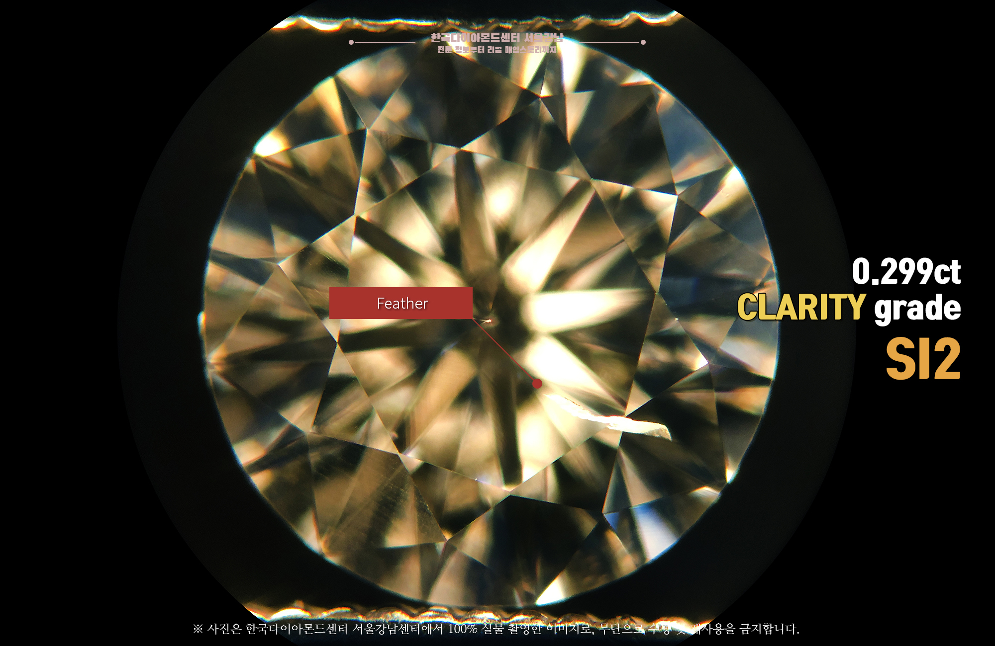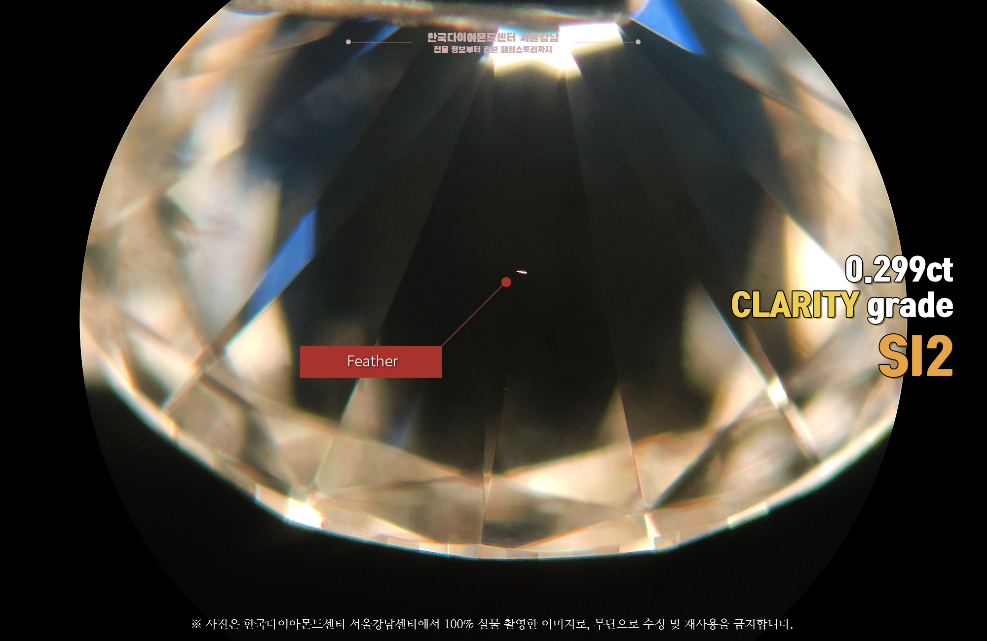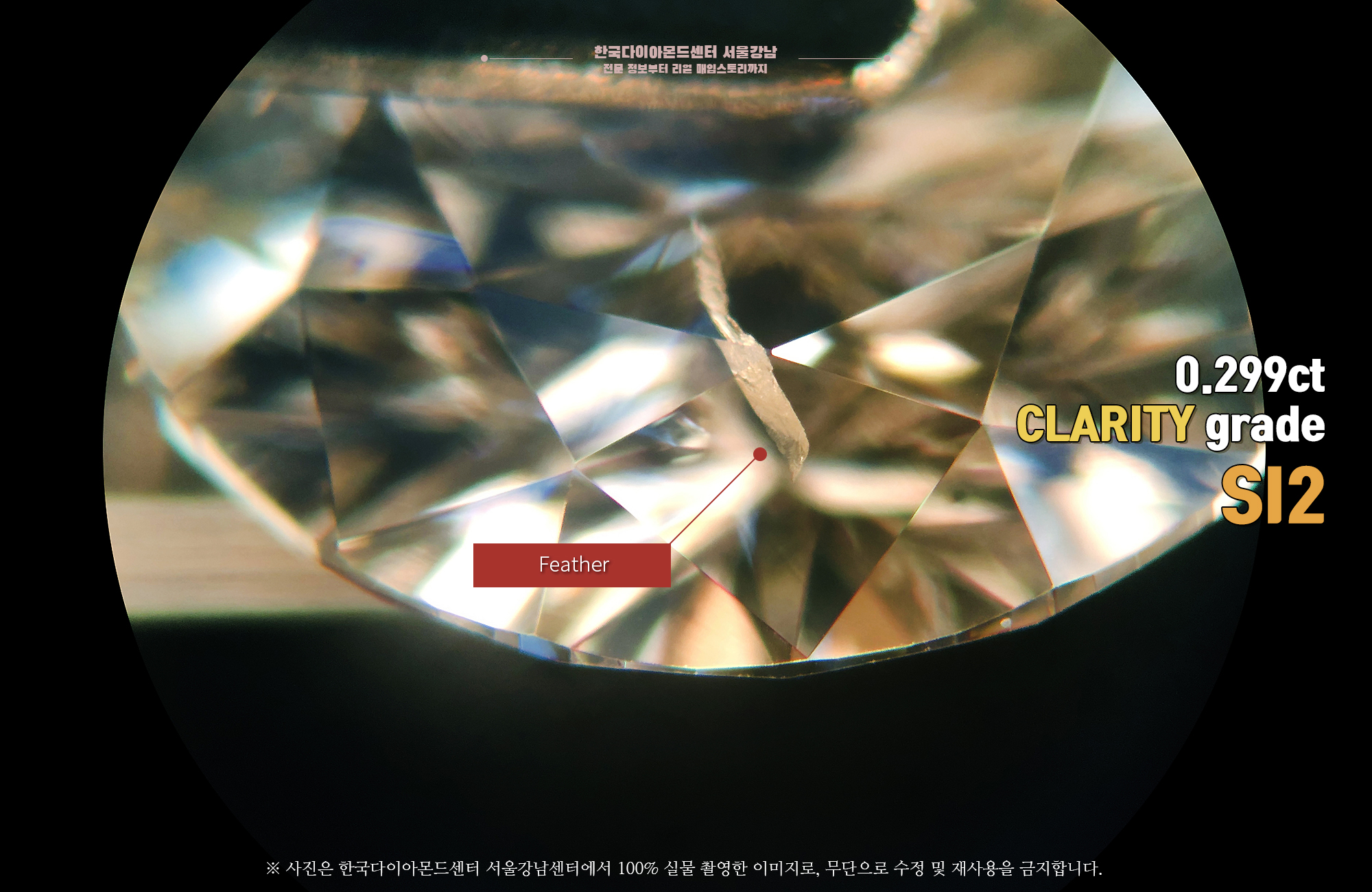 투명도(clarity) - SI2 등급으로 눈에 띄는 내포물을 포함하고 있습니다. 감정서 다이아몬드 그림에 보면, Ftr(페더) 내포물이 표기되어 있습니다. 현미경에서 촬영한 사진에서 보면, 눈에 띄게 보이는 페더의 깨진면을 확인할 수 있으며, 외부면에 닿아있는 상태로 내구성에 영향을 줄 수 있는 부분 입니다.