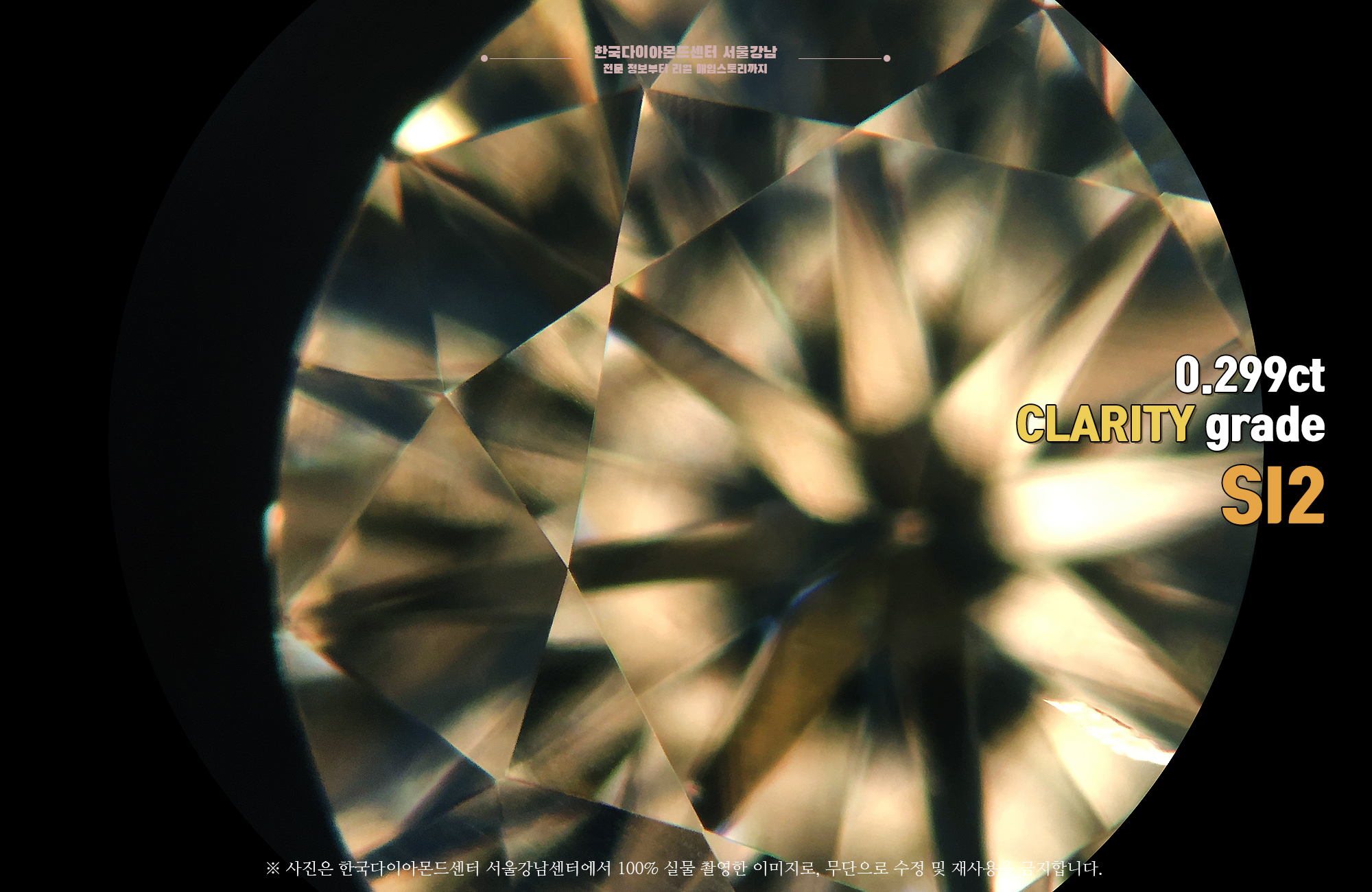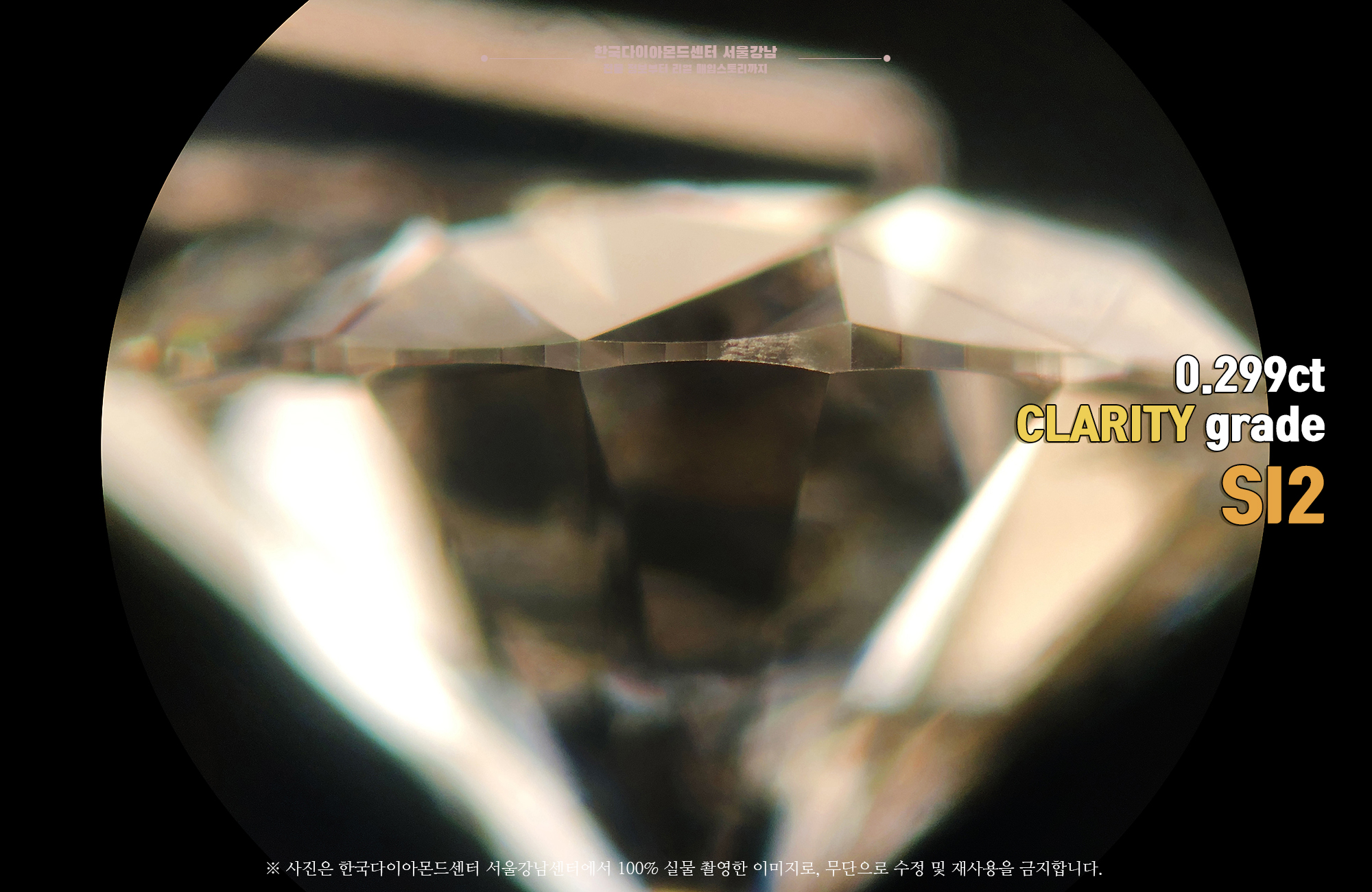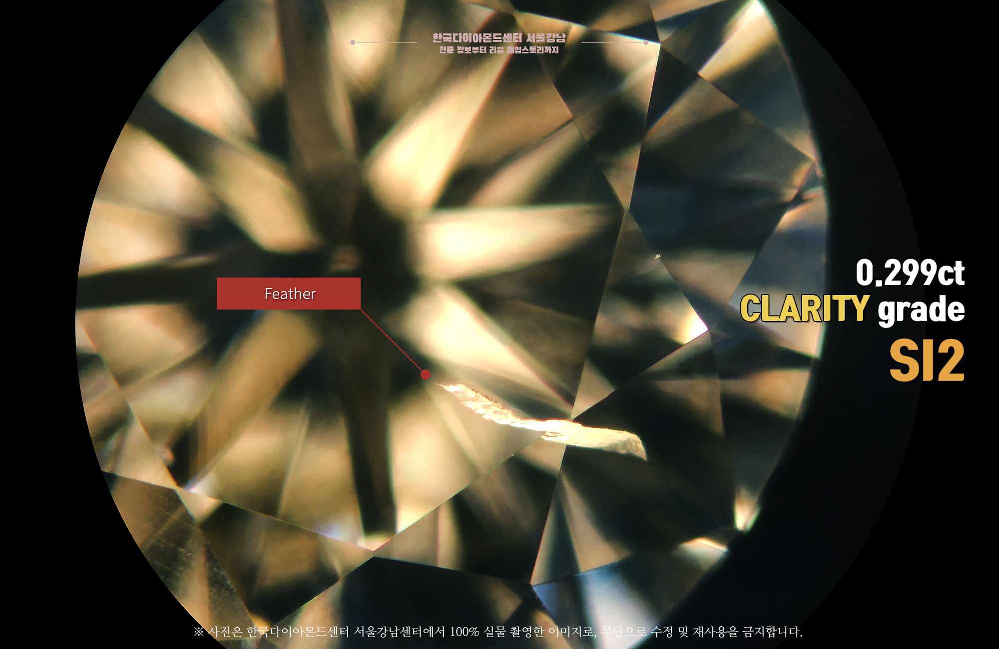 투명도(clarity) - SI2 등급으로 눈에 띄는 내포물을 포함하고 있습니다. 감정서 다이아몬드 그림에 보면, Ftr(페더) 내포물이 표기되어 있습니다. 현미경에서 촬영한 사진에서 보면, 눈에 띄게 보이는 페더의 깨진면을 확인할 수 있으며, 외부면에 닿아있는 상태로 내구성에 영향을 줄 수 있는 부분 입니다.