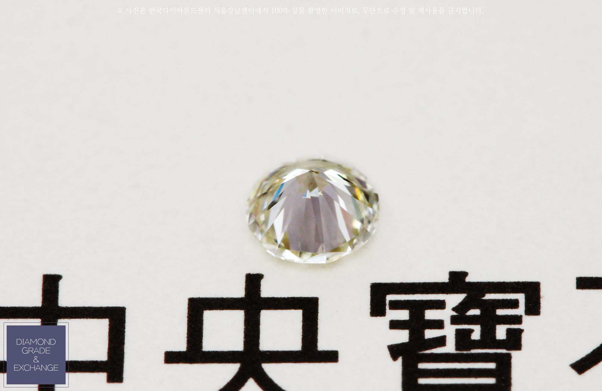부산 중앙감정서는 2단계 정도 낮은 편으로 컬러 등급에서 차이가 있습니다....(사진)...위 사진에서 보면, 양쪽 샘플과 비교해서 옐로우 컬러가 비치는 걸 쉽게 확인할 수 있는 상태로 G 컬러보다 2등급 낮은 I 컬러 입니다.