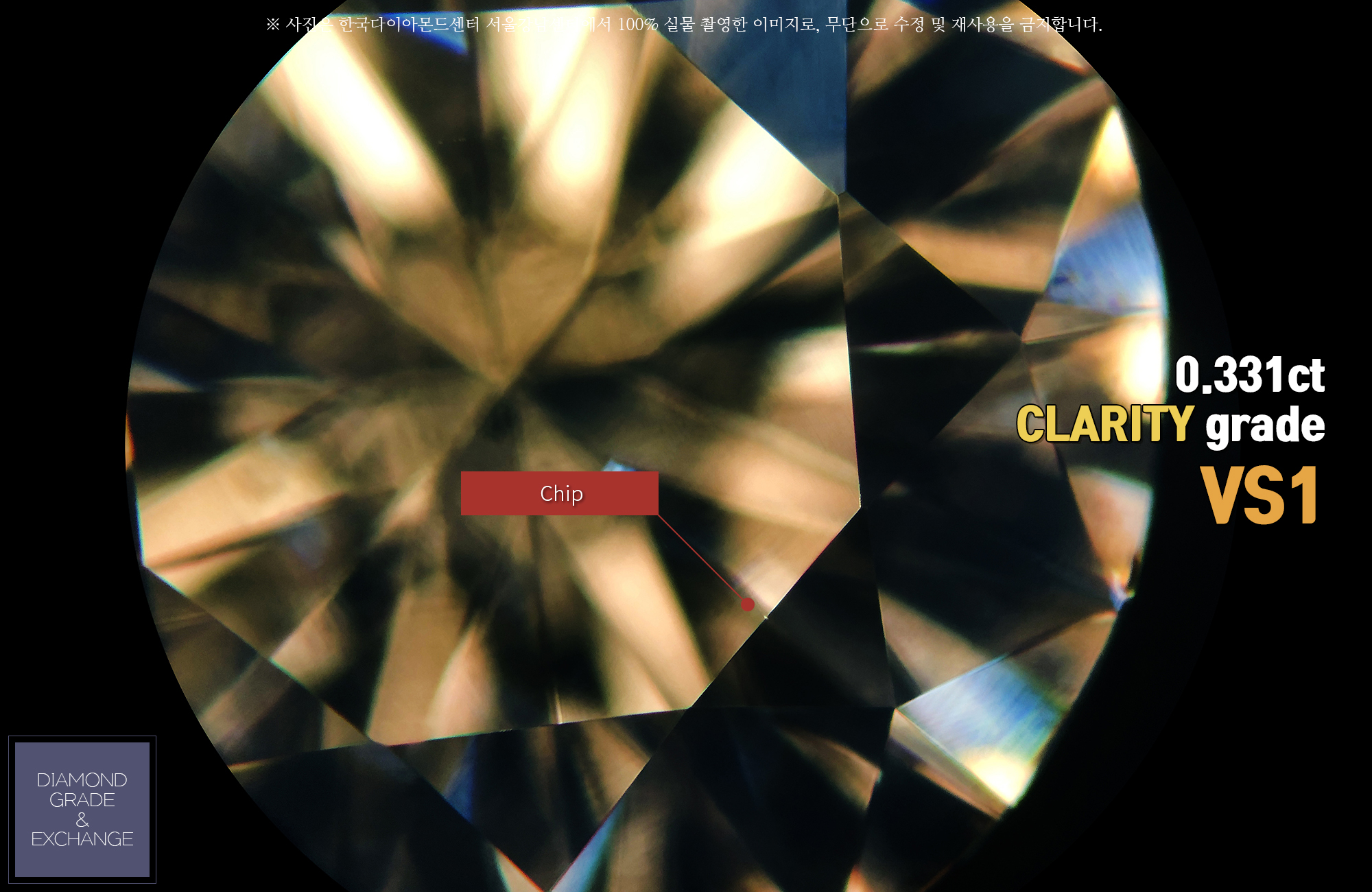 투명도(clarity) - VS1 등급으로 작은 내포물이 포함되어 있습니다. 정면 테이블 패싯면 4시 방향 능선 부분이 깨져나간 칩(Chip) 내포물이 확인됩니다. 그리고 가운데 부분에서 흰점들이 늘어선 상태로 확인되는 결정내포물이 있습니다.