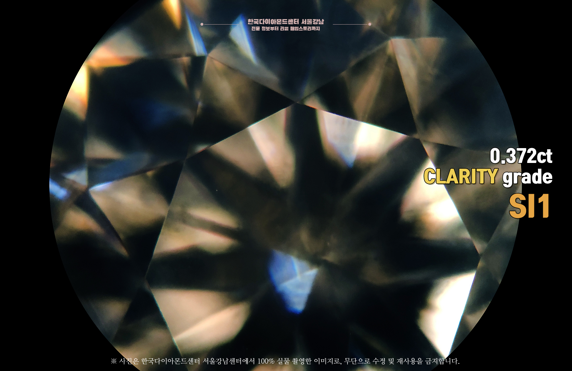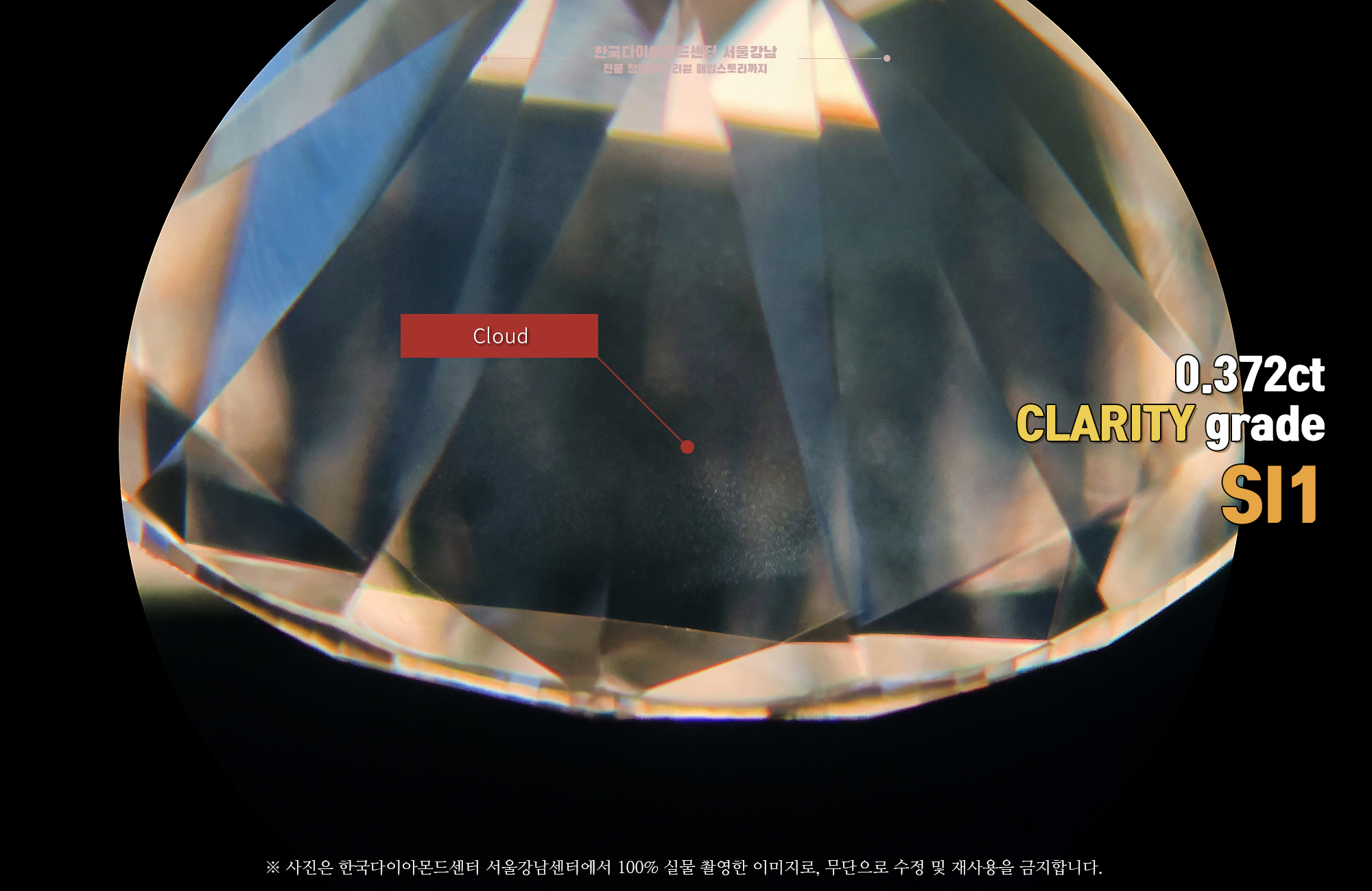 0.37캐럿은 3시 방향 테두리에 흰색으로 깨진면이 보이는 페더가 있습니다. 그리고 흰점들이 넓게 퍼져있는 형태로 확인되는 클라우드 내포물이 확인됩니다.