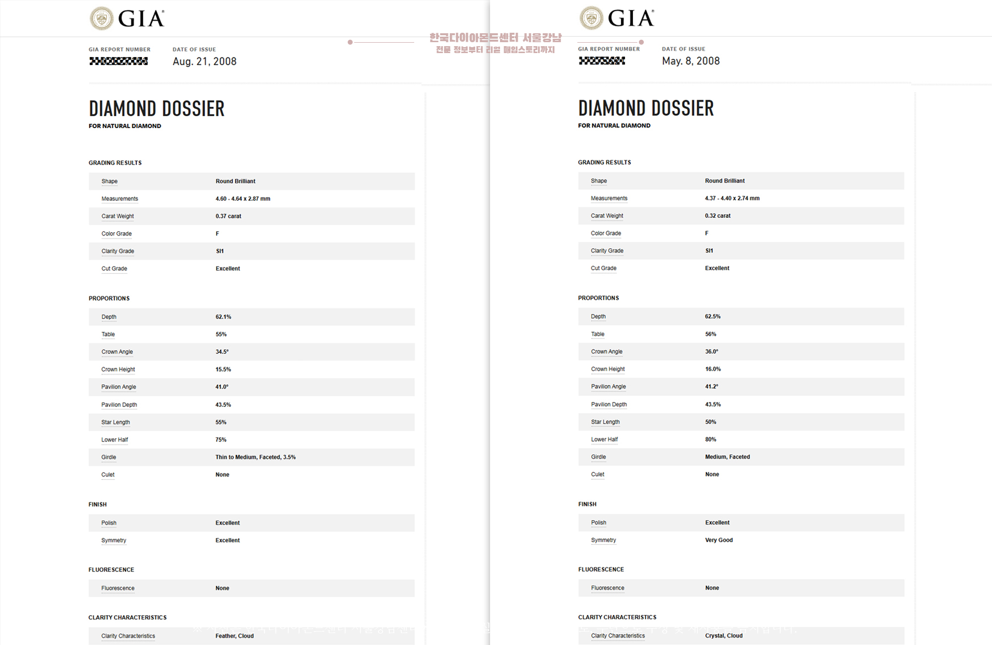 미국 GIA감정서가 발행되어 있고, 0.37캐럿 컬러 F 투명도 SI1 컷 Triple Excellent 등급, 0.32캐럿 컬러 F 투명도 SI1 컷 Excellent 등급 입니다.