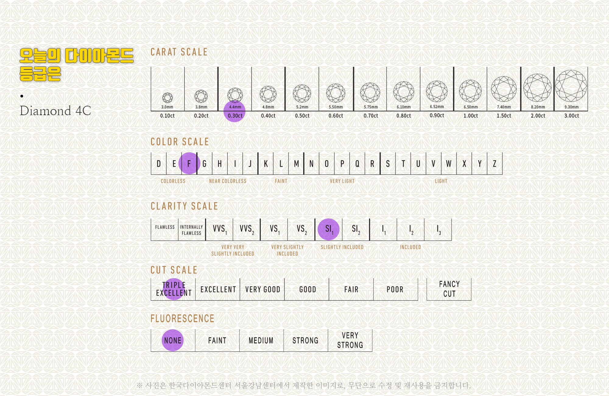 캐럿 중량(carat weight) - 감정서에 발행되어 있는 등급은 0.37캐럿과 0.32캐럿 입니다. 실제 저울에서 확인되는 중량은 0.372캐럿과 0.322캐럿으로 소수점 세번째자리 생략되어 0.37캐럿과 0.32캐럿으로 거래되는 다이아몬드 입니다.