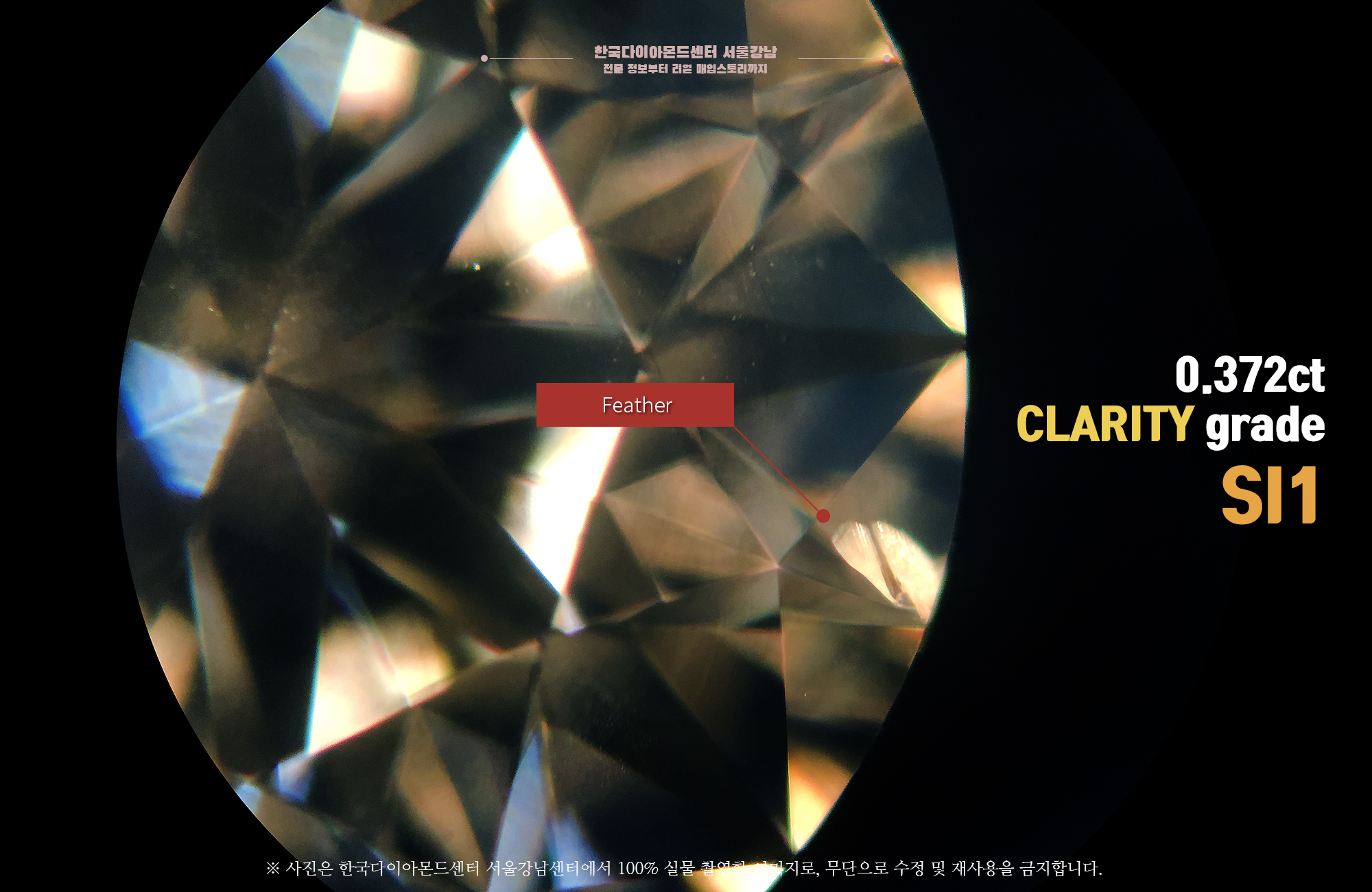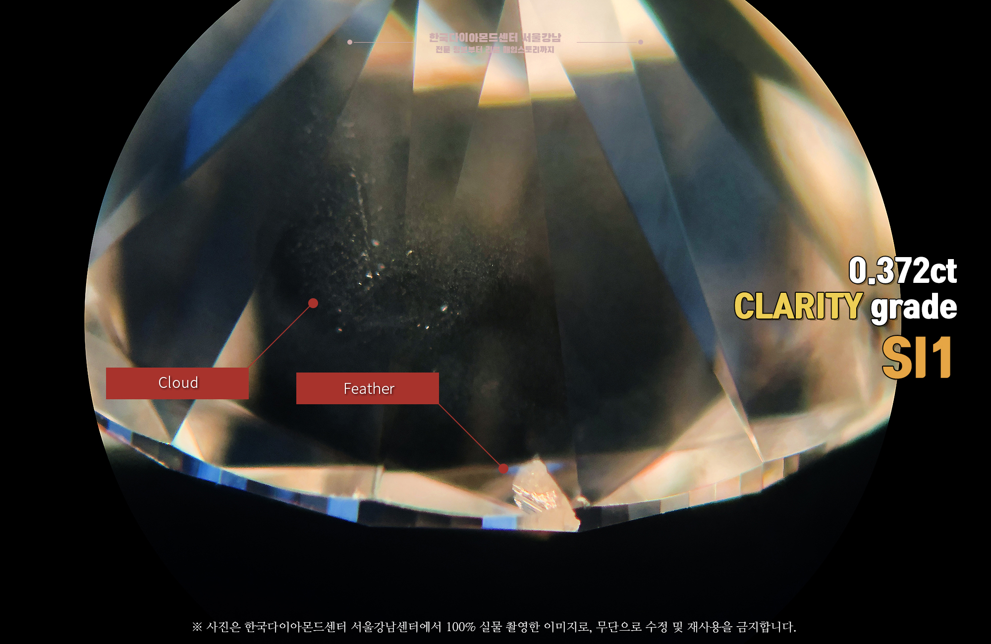 투명도(clarity) - SI1 등급으로 특징적인 내포물을 포함하고 있습니다. 감정서 하단에는 Feather(페더), Cloud(클라우드), Crystal(결정) 내포물이 표기되어 있습니다.