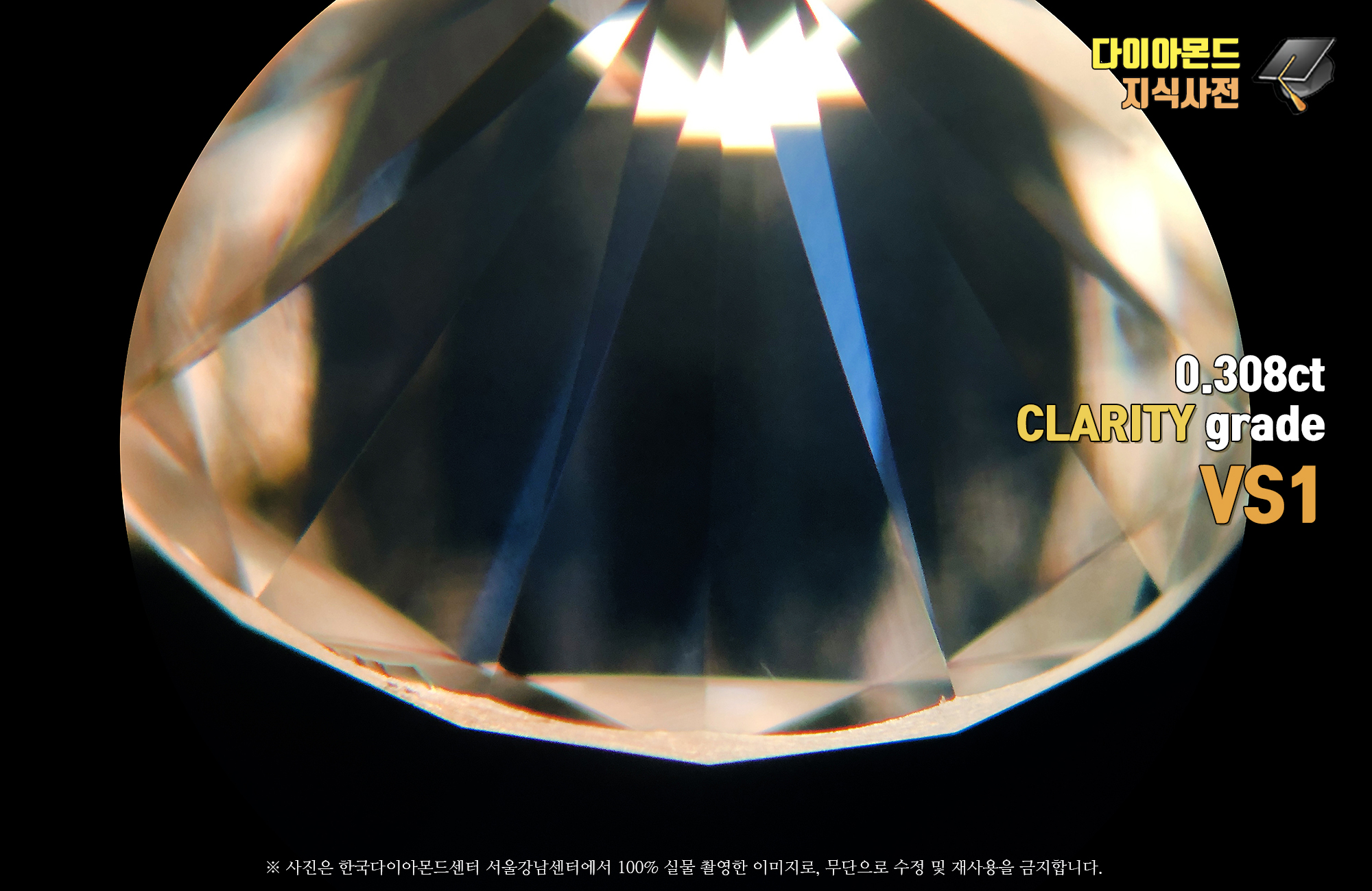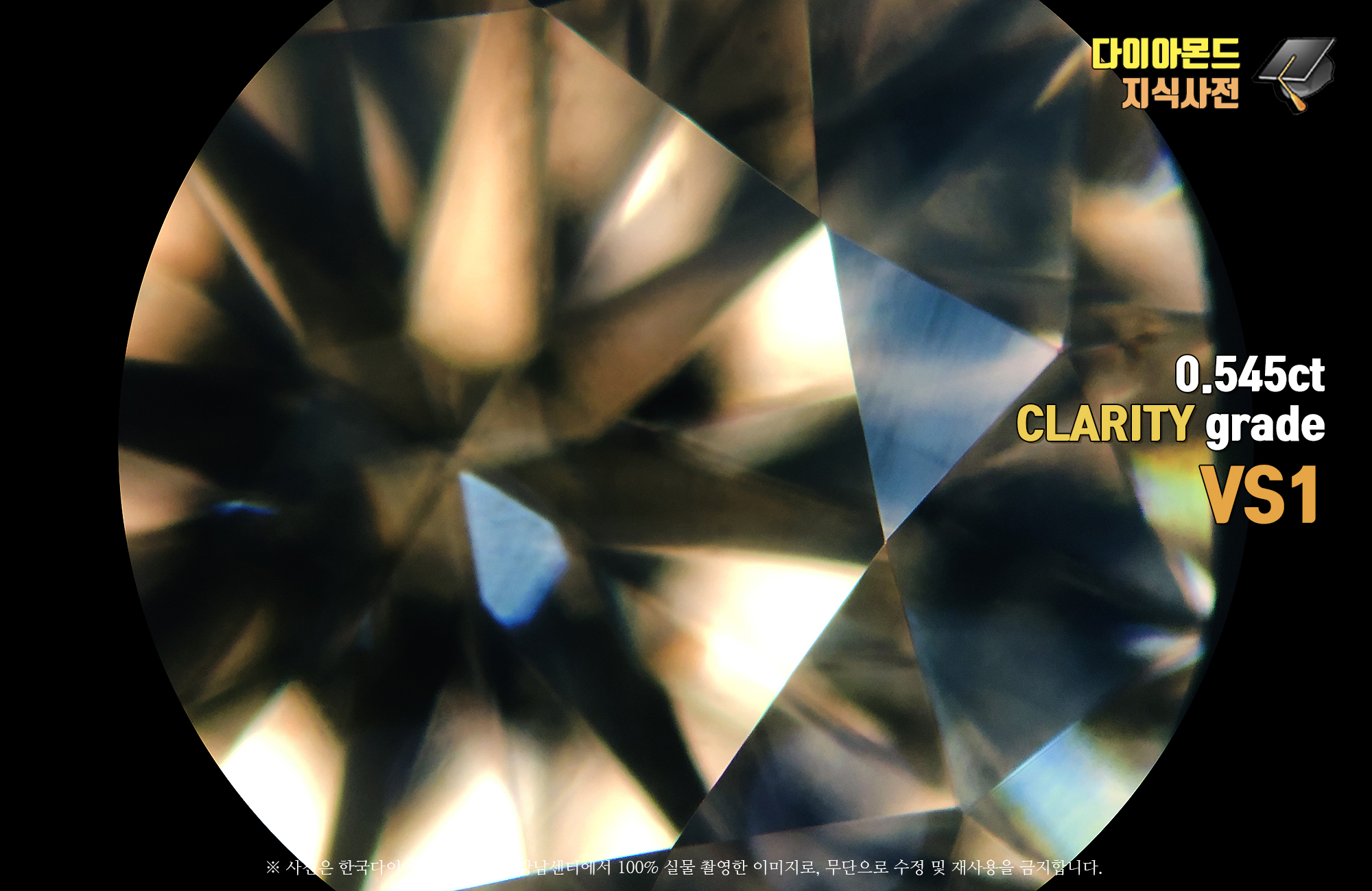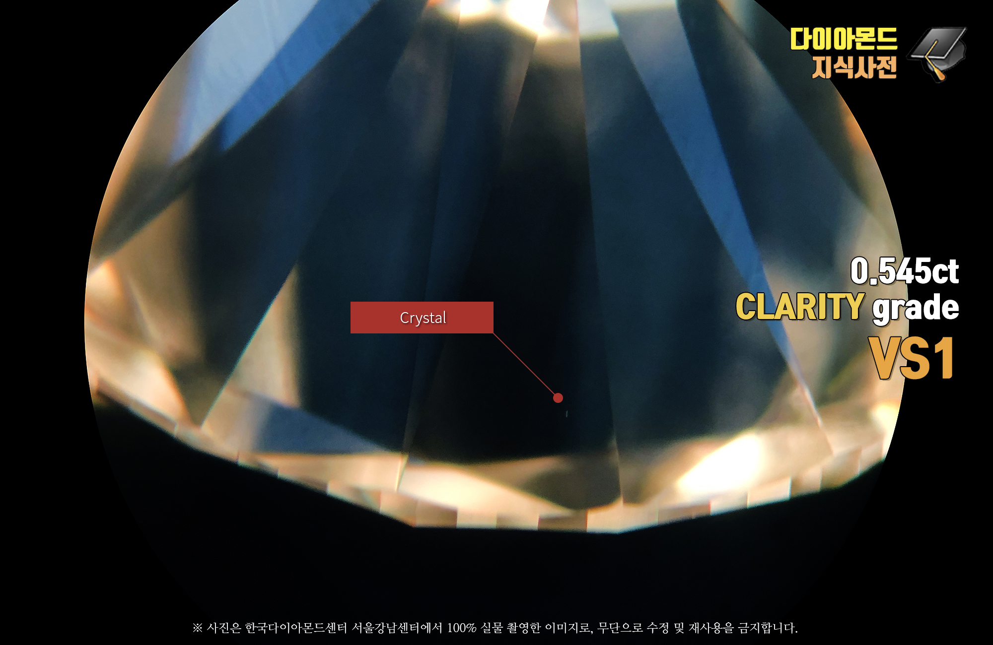 투명도(clarity) - 5부와 3부는 VS1 등급으로 작은 내포물을 포함하고 있습니다. 정면에서 보면, 작은 크기로 확인되는 흰색 결정내포물이 확인되며, 3부는 뒷면 패싯면 표면에 넓게 긁힌 흔적이 보이는 스크래치가 확인됩니다.