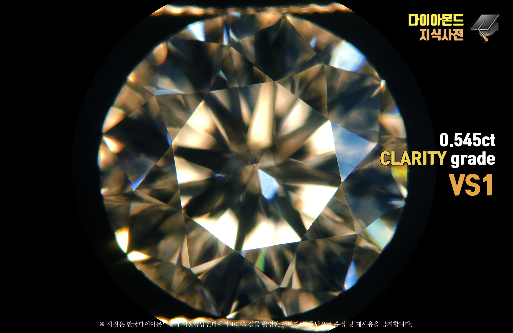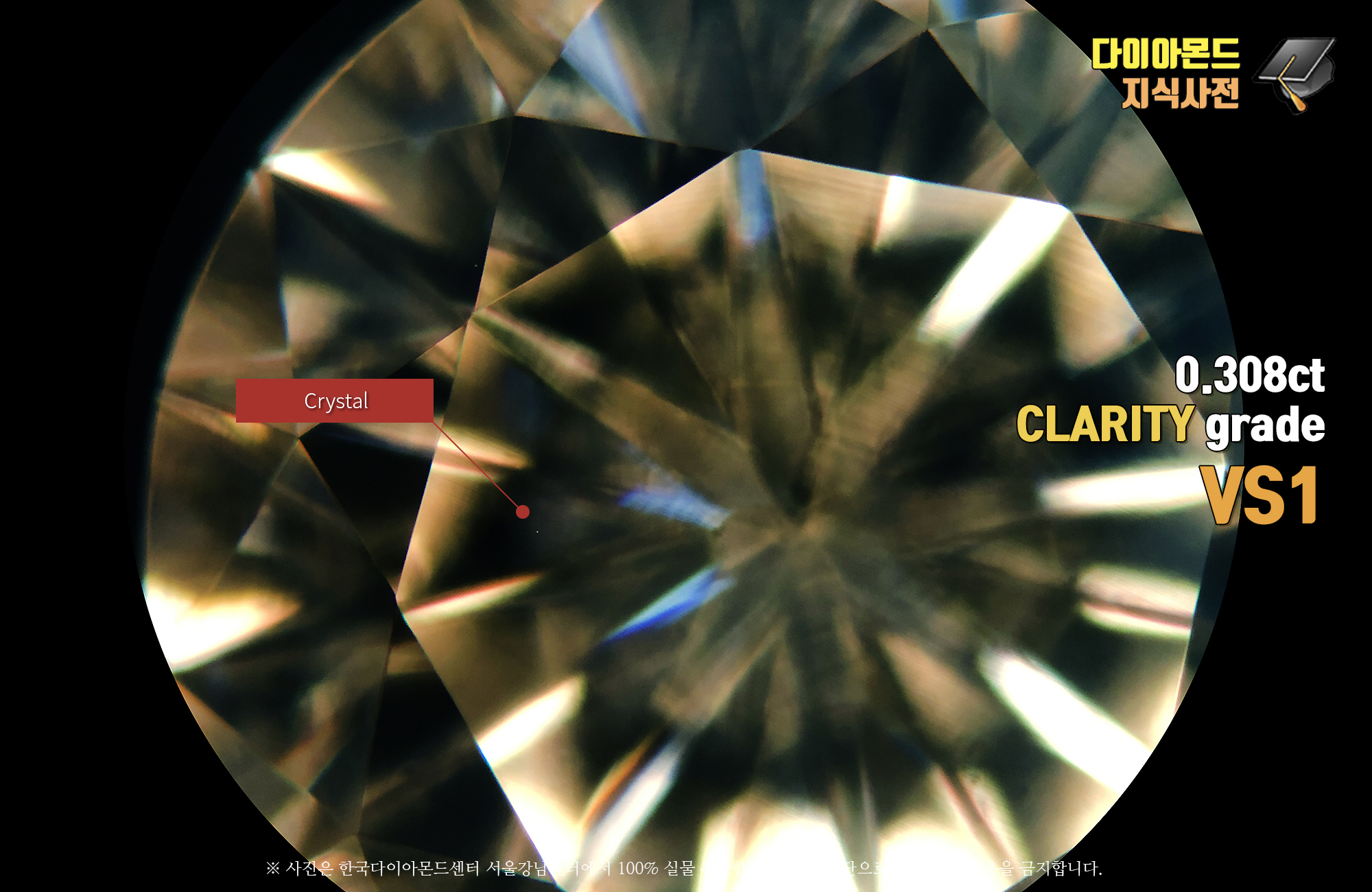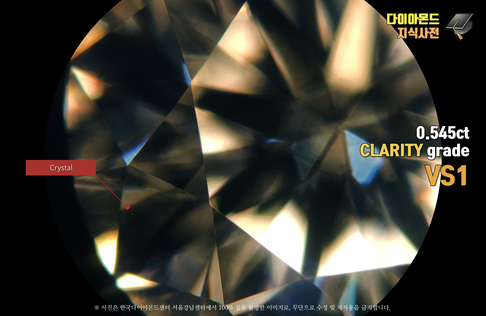 투명도(clarity) - 5부와 3부는 VS1 등급으로 작은 내포물을 포함하고 있습니다. 정면에서 보면, 작은 크기로 확인되는 흰색 결정내포물이 확인되며, 3부는 뒷면 패싯면 표면에 넓게 긁힌 흔적이 보이는 스크래치가 확인됩니다.
