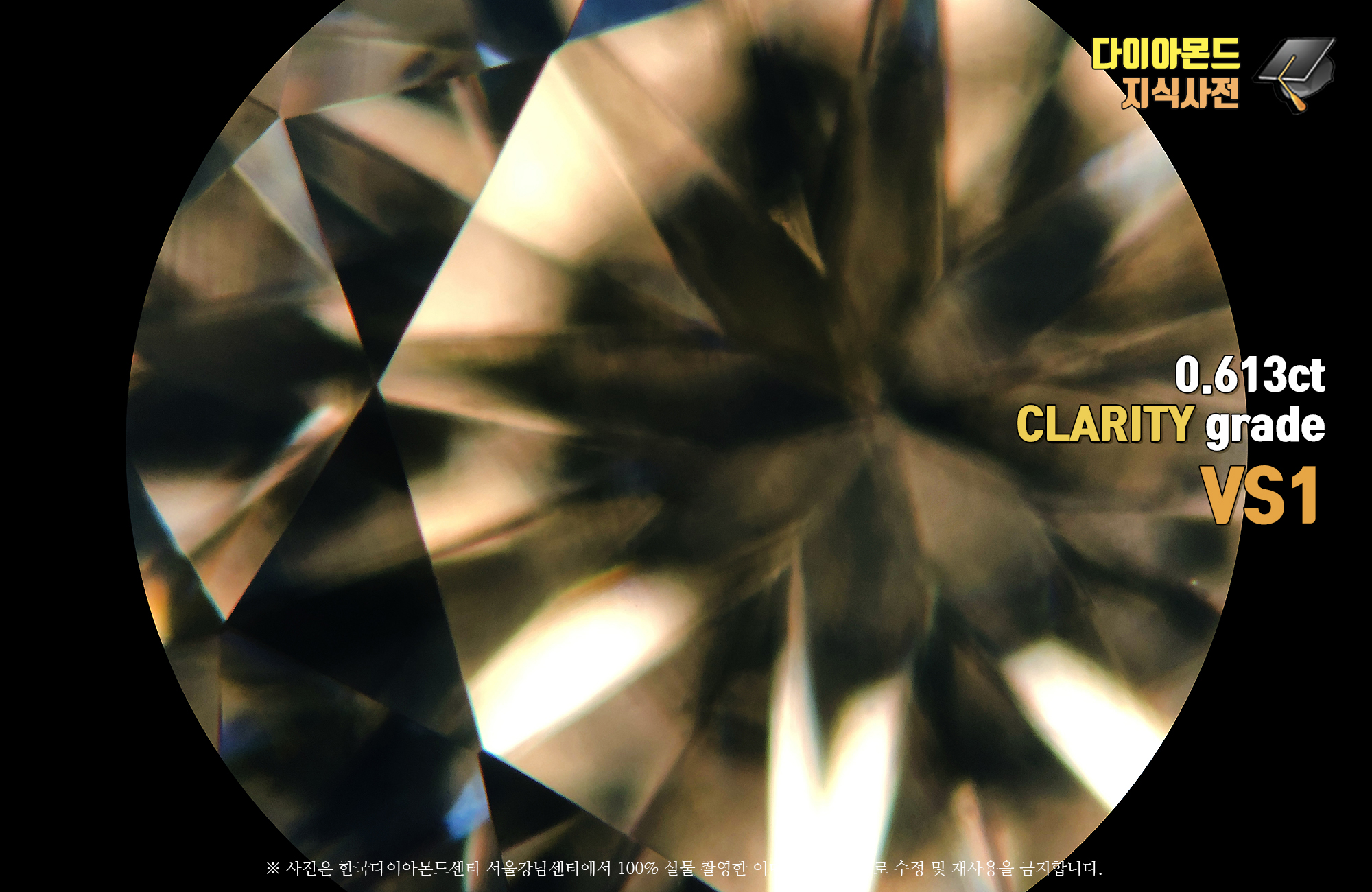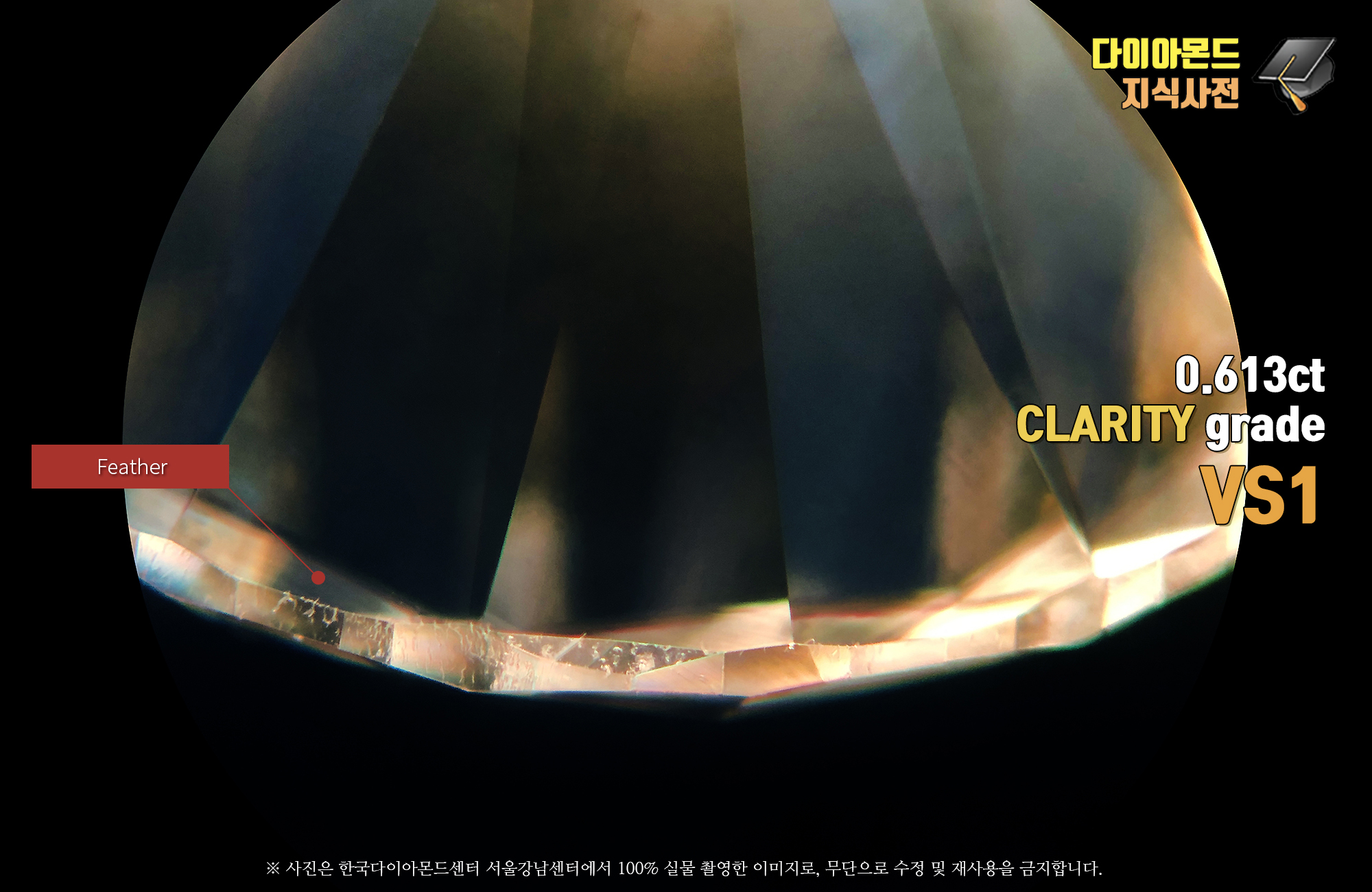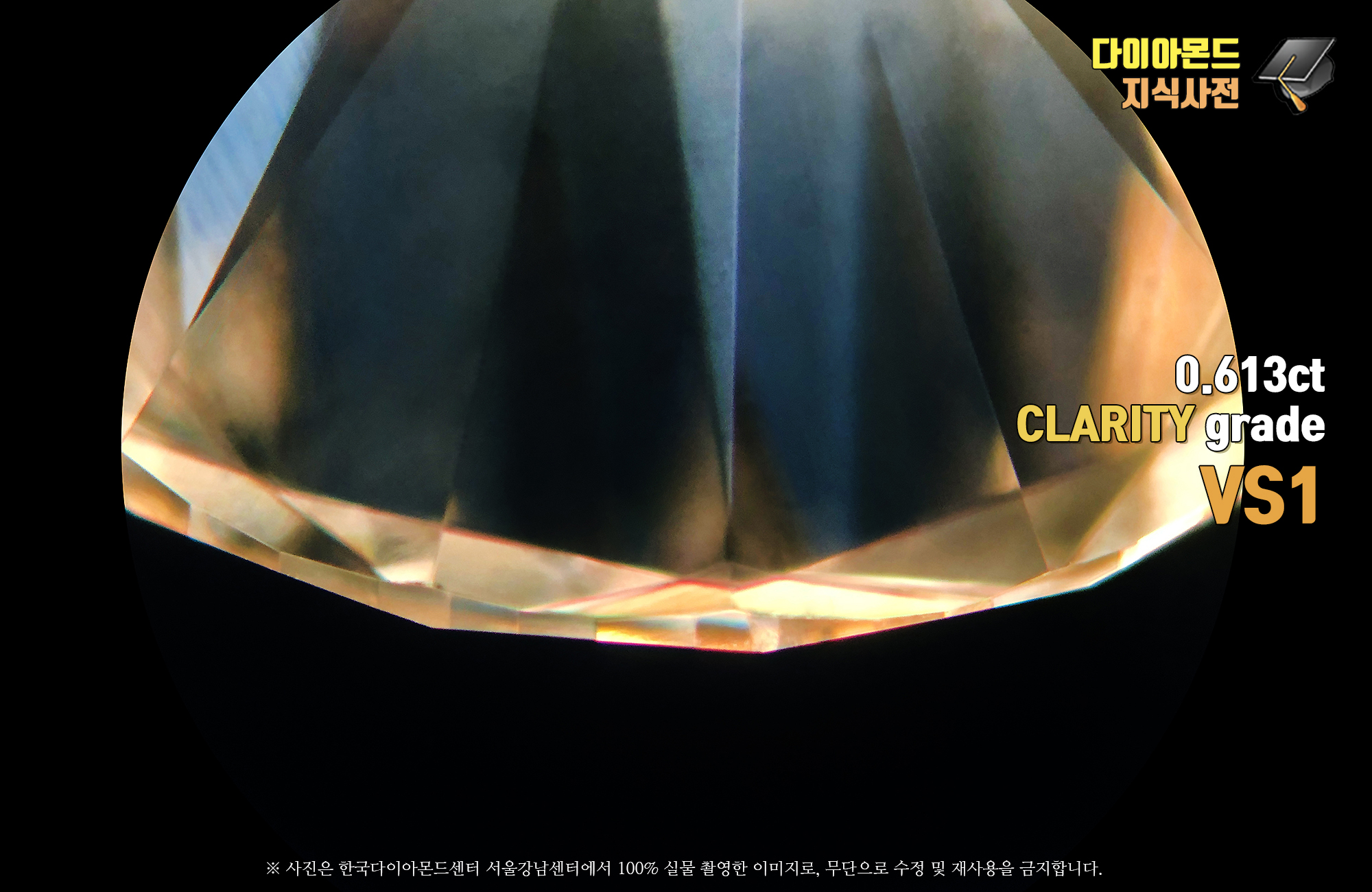 투명도(clarity) - VS1 등급으로 작은 내포물을 포함하고 있습니다. 정면에서 보면, 가운데 테이블 패싯면 4시 방향에 흰색 점으로 확인되는 결정내포물을 볼 수 있습니다. 그리고 뒷면에서 보면, 테두리 거들 부분에서 작은 페더 내포물이 여러개 확인되며, 엑스트라 패싯면도 확인됩니다.