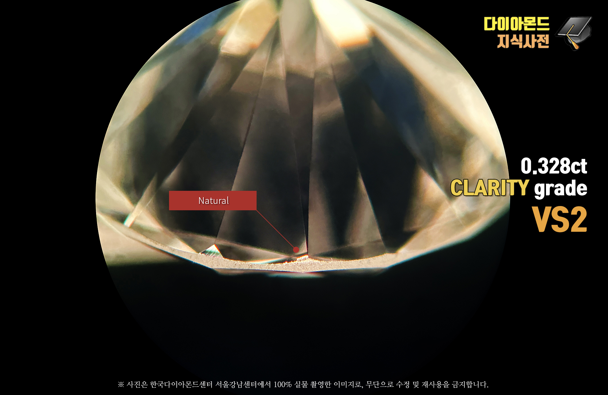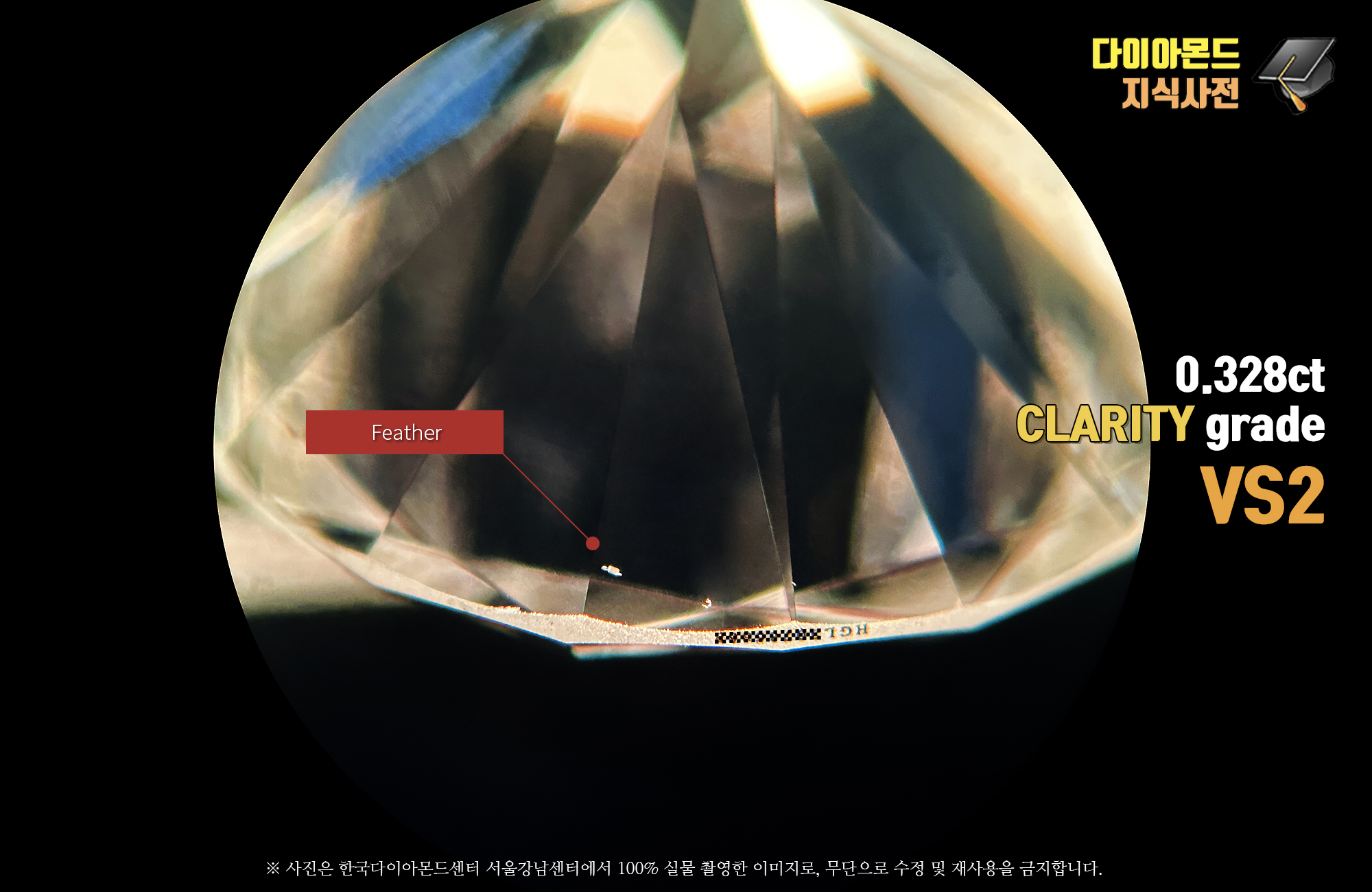 투명도(clarity) - VS2 등급으로 작은 내포물을 포함하고 있습니다. 정면 가운데 흰색으로 보이는 결정내포물을 확인할 수 있으며, 5시 방향 스타패싯면에서 마모된 능선과 함께 긁힌 부분을 확인할 수 있습니다. 그리고 뒷면에서 보면, 거들 테두리 부분에서 네추럴과 엑스트라 패싯 그리고 작은 페더 내포물을 볼 수 있습니다.