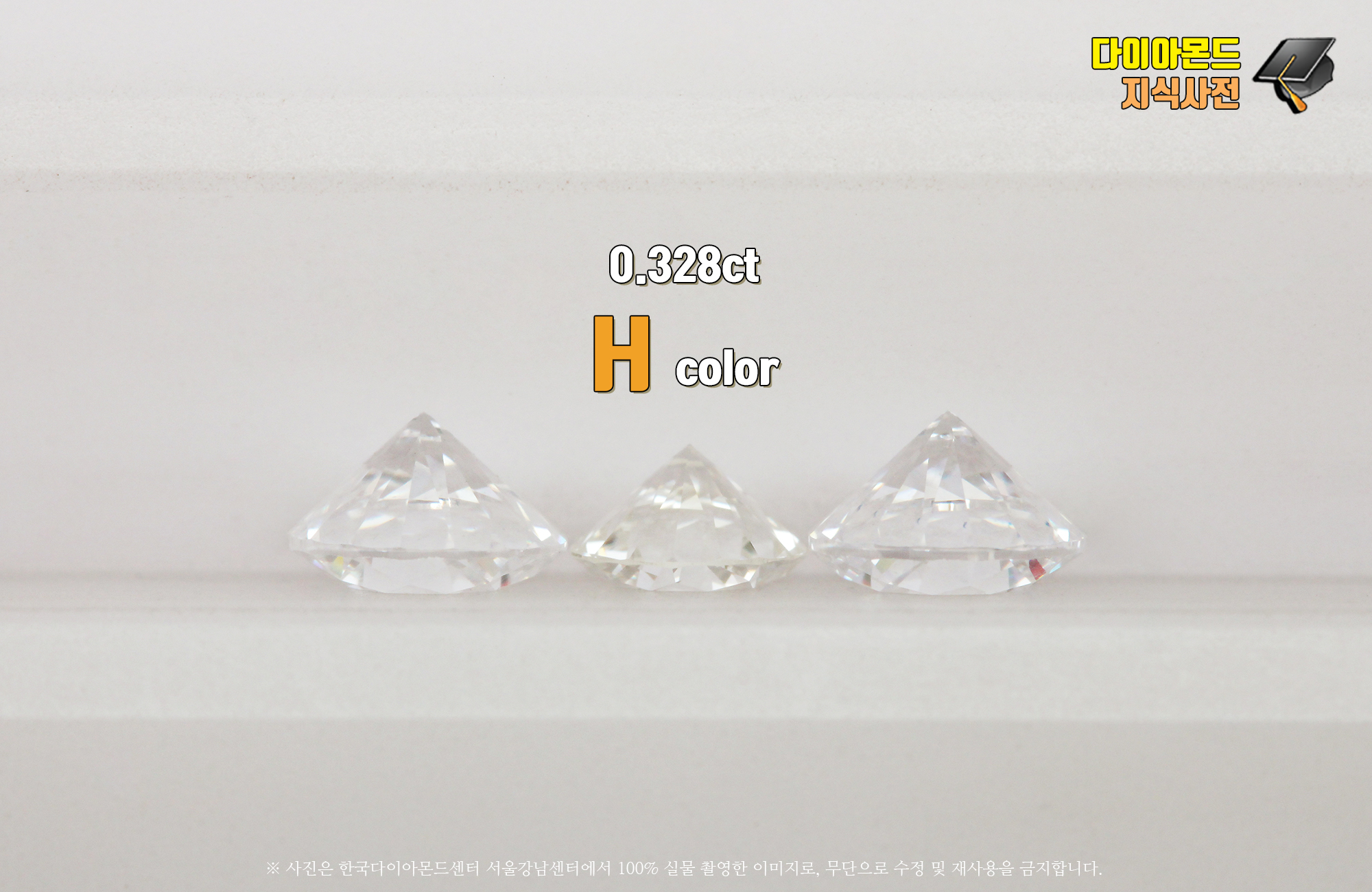 직접 보시면, 양쪽 샘플과 비교해서 옐로우 컬러가 연하게 비치는 걸 확인하실 수 있는 H 등급 입니다."