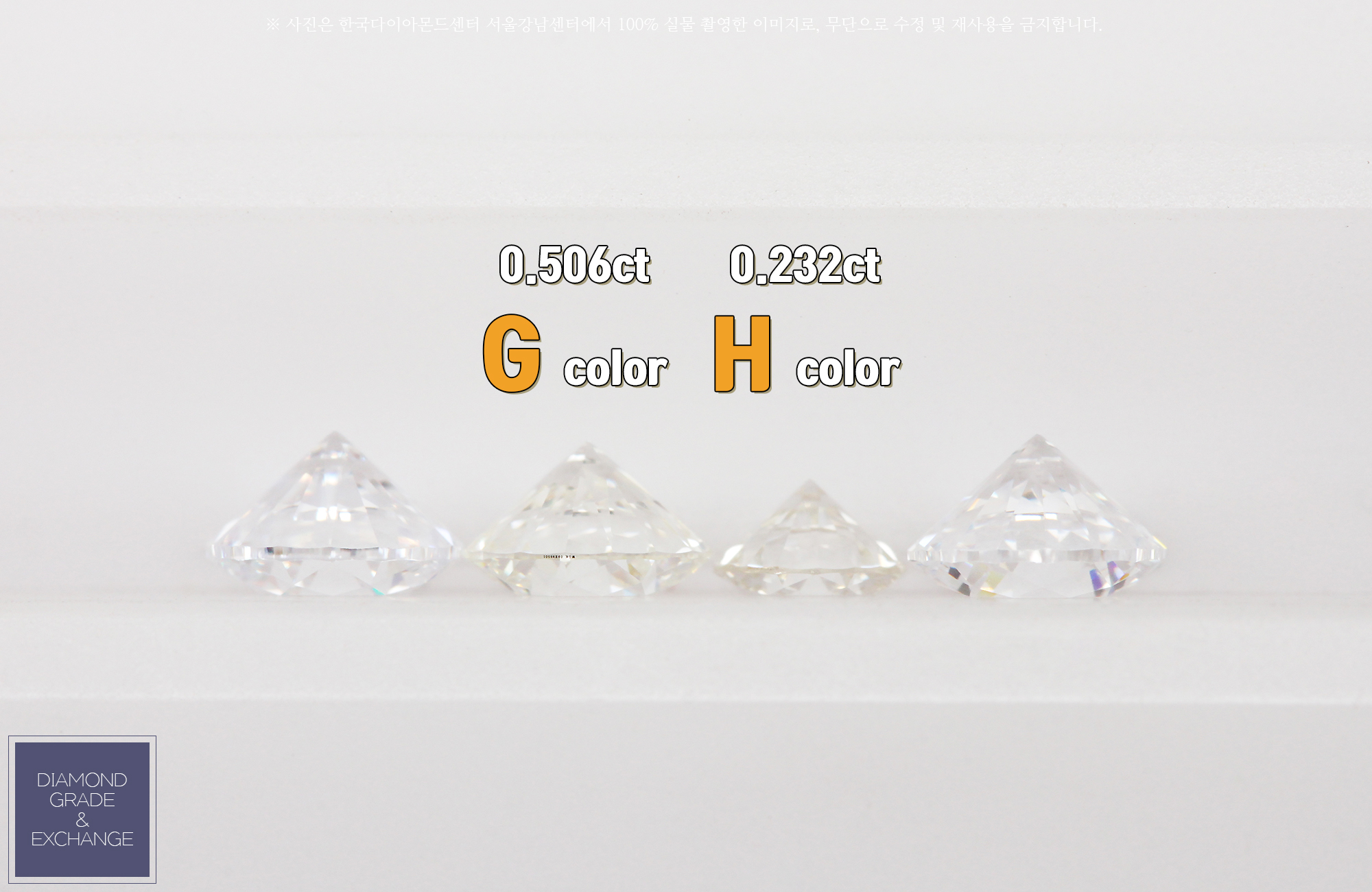 5부 다이아몬드는 객관적 기준에 부합하는 우신감정서가 발행되어 컬러 G 등급이 맞지만, 2부 다이아몬드는 현대감정서로 실제 컬러 등급은 H 등급으로 한 등급 낮게 확인됩니다."