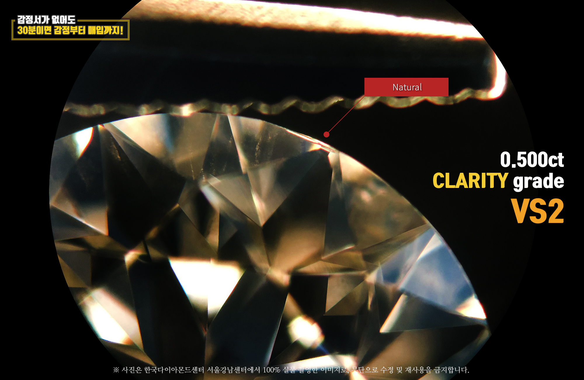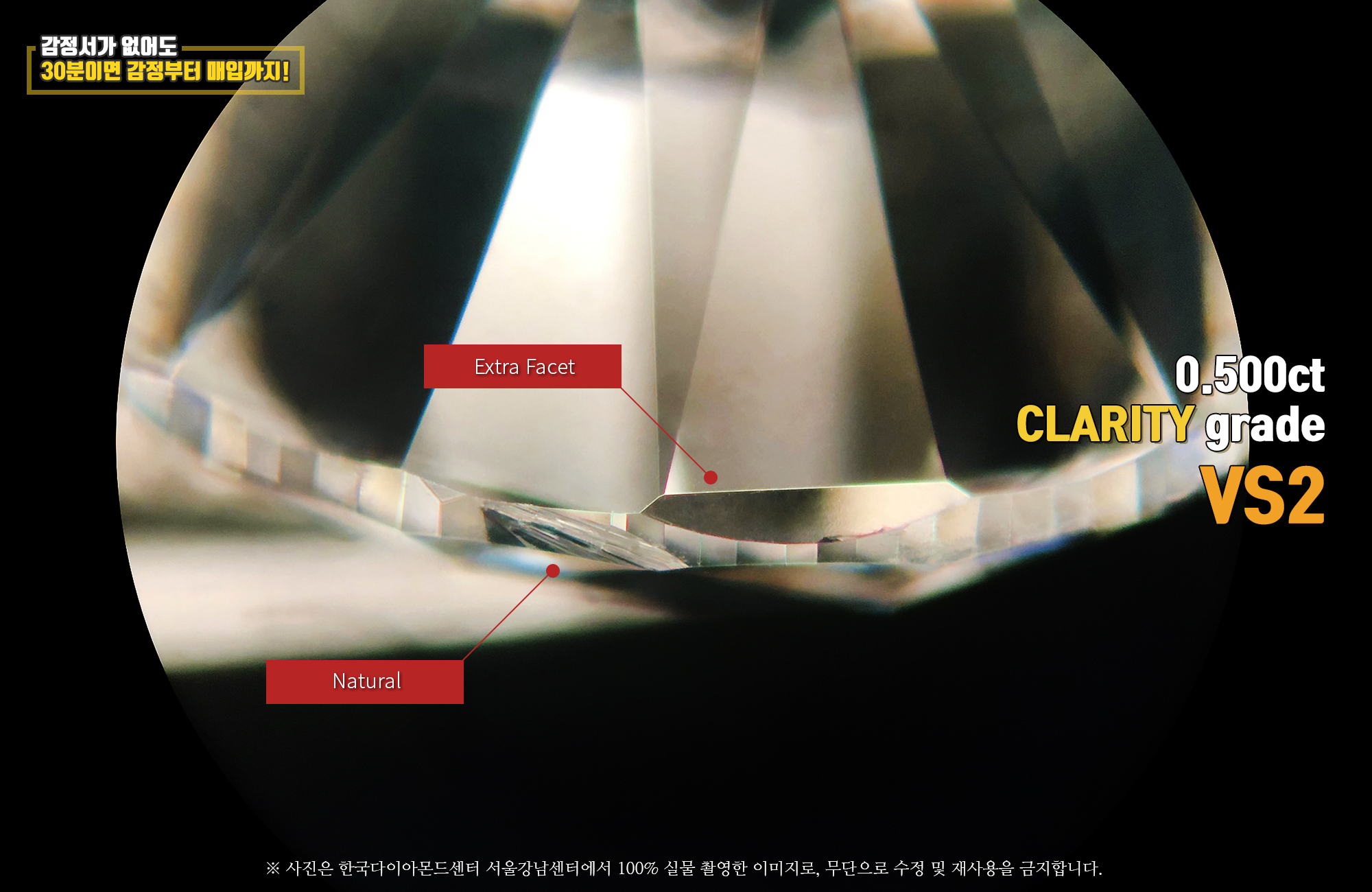 투명도(clarity) - VS2 등급으로 작은 내포물을 포함하고 있습니다. 정면 가운데에서 먼지처럼 보이는 클라우드와 결정이 함께 확인되며, 테두리 부분에서는 원석 표면이 남아있는 네추럴이 관찰됩니다. 뒷면 거들 부분에서는 큰 면적으로 엑스트라 패싯이 눈에 띄게 확인됩니다.