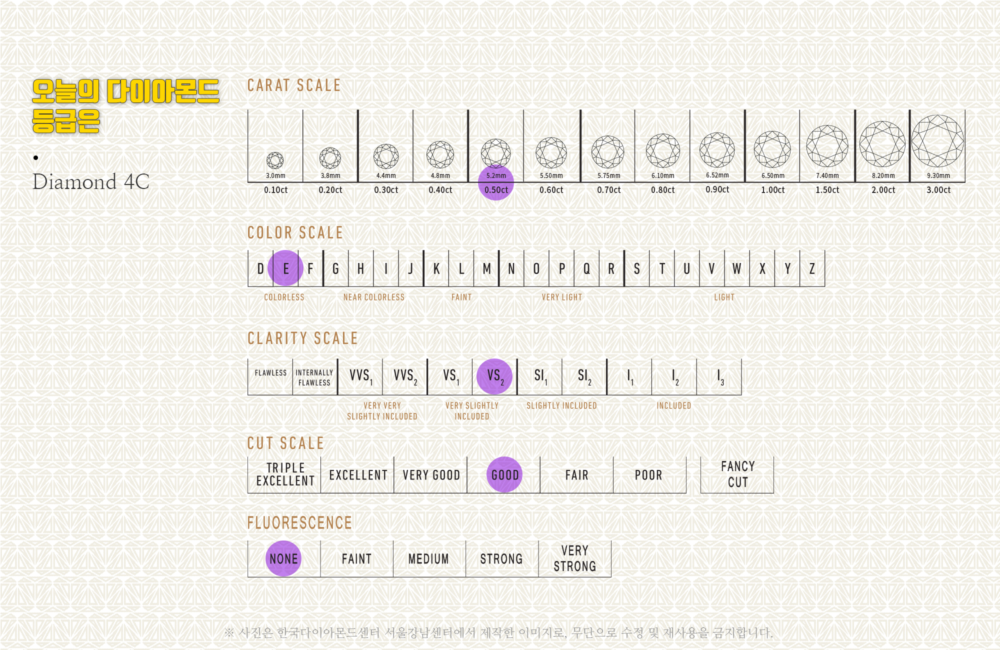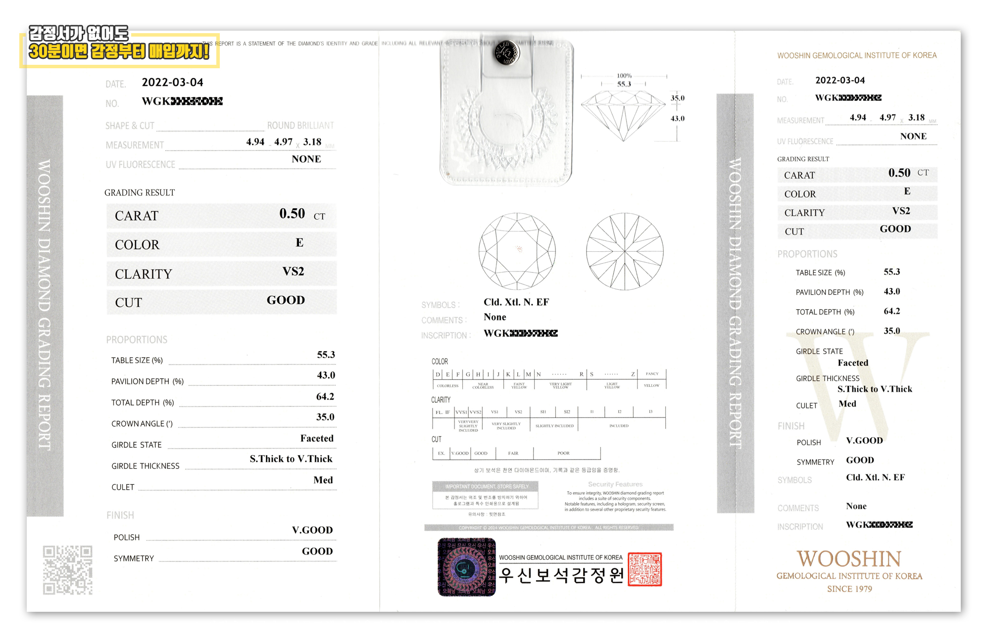 대표 감정사 유실장 "가져오신 우신감정서를 보면 0.50캐럿에 컬러 E, 투명도 VS2 등급으로 색상과 내포물 등급은 높습니다. 하지만 컷 등급이 Good으로 낮고 큐렛 사이즈도 큰 편입니다.