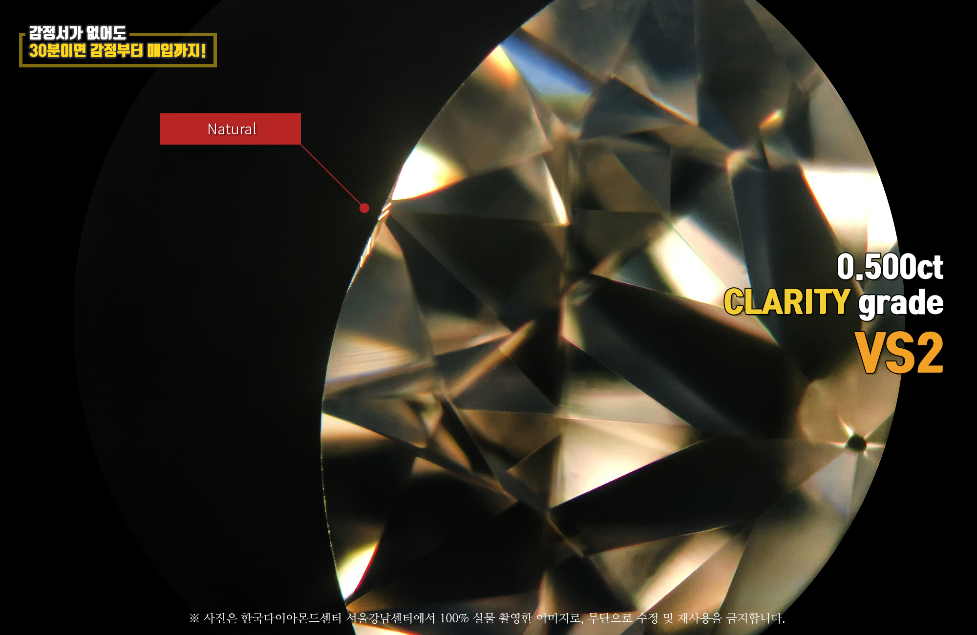내포물 상태를 현미경으로 직접 보여드릴게요. 정면 가운데 먼지처럼 보이는 클라우드와 결정이 함께 있고, 테두리에는 네추럴이 확인됩니다."