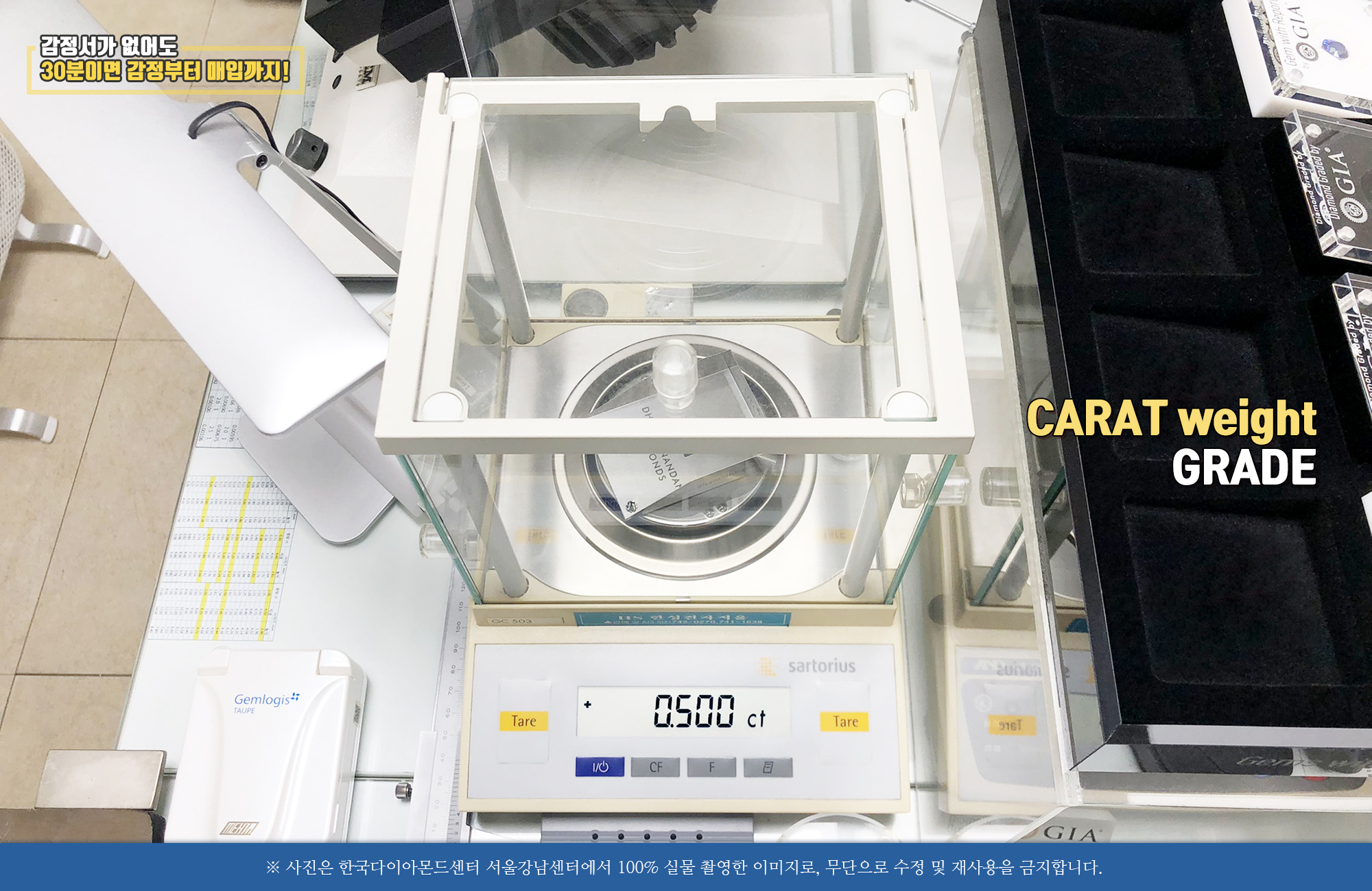 캐럿 중량(carat weight) - 우신감정서에는 0.50캐럿으로 발행되어 있습니다. 실제 저울에서 확인되는 중량은 0.500캐럿으로 소수점 세 번째 자리가 생략되어 0.50캐럿으로 거래되는 5부 다이아몬드입니다.