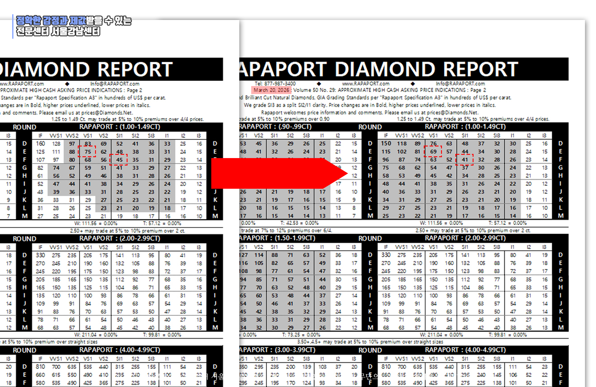 안녕하세요. 한국다이아몬드센터 서울강남점 유한수 감정사 입니다. 오늘은 다이아몬드 가격 추가 하락분에 대해 이야기 해드려요. 작년 한해에도 5차례 가격은 하락했으며, 한동안 약보합세를 유지하고 있었습니다. 하지만, 2025년 10월 31일 하락이후 5개월만에 다시 추가 하락했습니다. 5개월만에 하락이였지만, 하락폭은 여전히 큰 상황으로 다이아몬드 가격 하락은 아직도 멈추지 않았습니다. 아래에서 대표적인 등급을 기준으로 시세 하락에 대해서 설명해드릴께요.